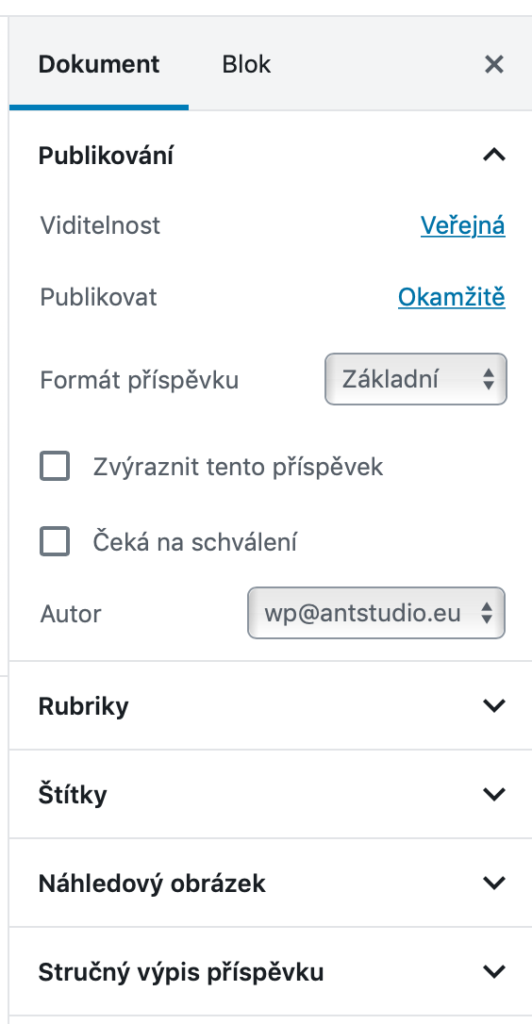 Podrobnější nastavení bloků/odstavců lze zvolit v panelu po pravé straně, stejně tak například rubriky, ke kterým se článek vztahuje, štítky, náhledový obrázek novinky a stručný popis článku.