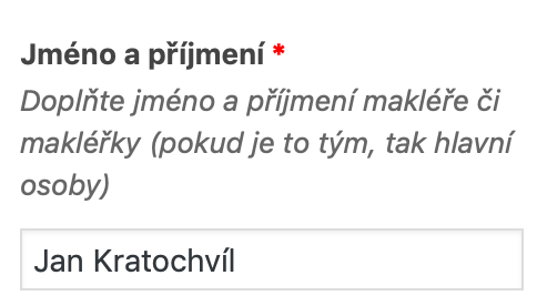 Jméno a příjmení: zde si makléř vyplní své celé jméno. Například – Ing. Miroslav Hodina nebo Kristýna Řezáčová, tj. je možné vyplnit titul, pokud ho makléř má.