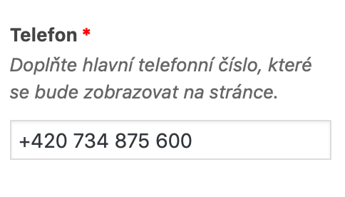 callcentra, na které chce, aby jej mohli návštěvnicí kontaktovat. Do pole se nesmí dostat žádný jiný text například callcentrum: +420 123 456 789. Dovolené je pouze samotné číslo s předvolbou. Číslo může obsahovat mezery.