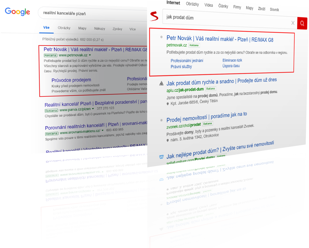 Reklamu ve výsledcích vyhledávání v Googlu a Seznamu